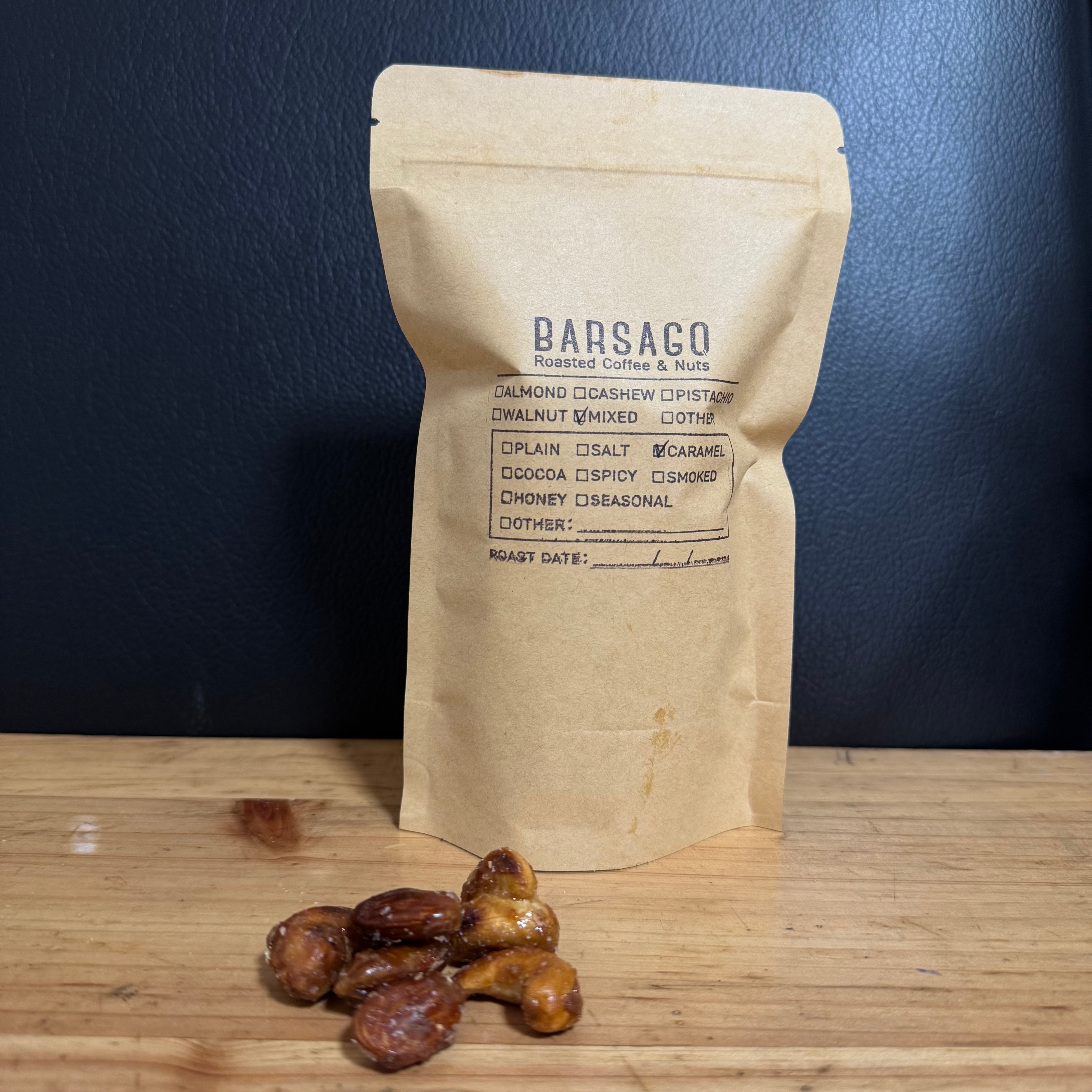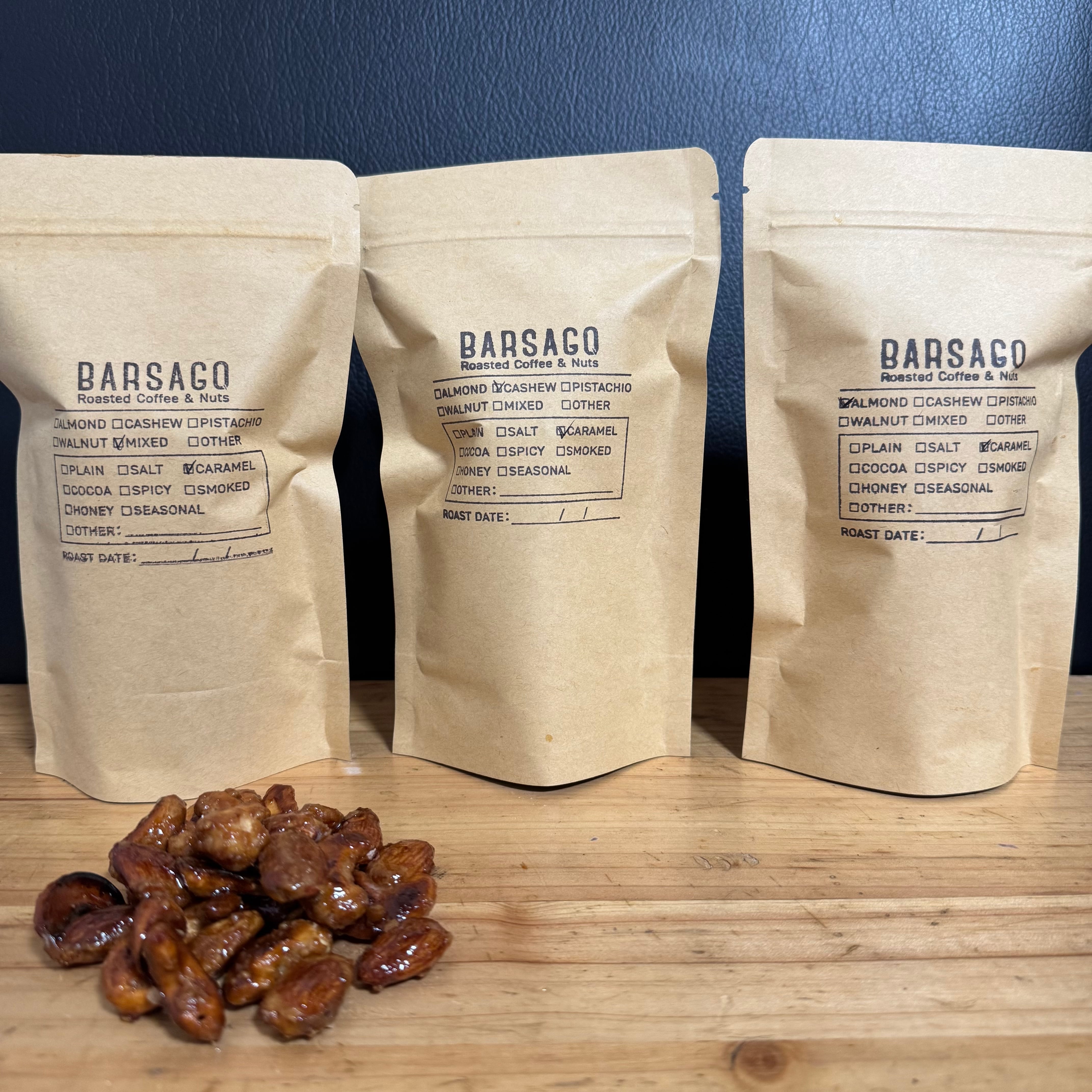 アーモンドとカシューナッツ、それぞれの個性を琥珀色のキャラメルで包み込み、仕上げに黒コショウを主軸としたBARSAGOオリジナルスパイスを纏わせました。